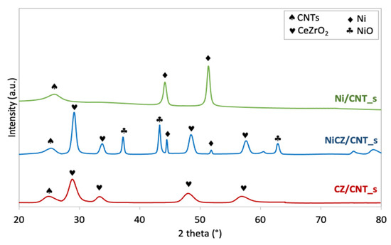 For the Ni/CNT and NiCZ/CNT samples, the diffraction peaks located at ca. 44.6 and 51.9° are assigned to (111) and (200) planes of Ni, respectively. The NiO phase occurs only in Ni/CZ sample and it is detected by the reflexions at 37.5, 43.5 and 63.0° corresponding to (101), (012) and (110) planes, respectively [46]. Hence, thermal decomposition of Ni(OH)2 on CNT support, precipitated from Ni(NO3)2 using NaOH, can be followed with partial (in the case of Ni/CNT) and total (for NiCZ/CNT) reduction of NiO to Ni. The presence of both NiO and Ni on the CNT walls in Ni/CNT catalyst after its annealing was reported e.g., in [47,48]. In the case of NiCZ/CNT catalyst annealing leads to Ni (the NiO phase is not detected by the XRD), and in this case, the total reduction of NiO to Ni can be caused by the strong contact between nickel phase and CeZrO2. Since the annealing of NiCZ/CNT was carried out at 500 °C, some oxygen could desorb from CeZrO2 crystal lattice, producing oxygen vacancies. The CeZrO2 is well-known for high oxygen mobility and redox properties that could facilitate the transformation of Ni(OH)2 to Ni.
