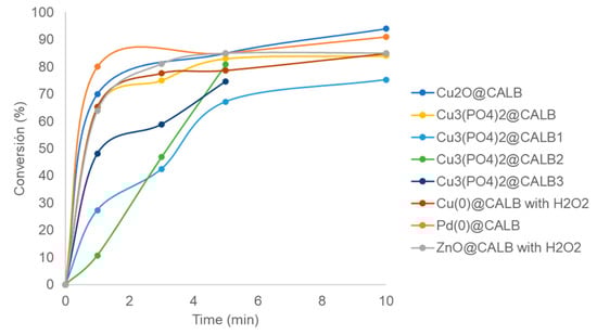 According to all these results, it was decided to choose the copper catalyst Cu2O@CALB for further studies since this metal is cheaper, less toxic and therefore more sustainable than palladium.