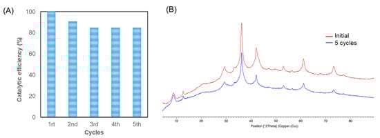(A) Recycling of Cu2O@CALB in oxidative degradation of TCE. Experimental conditions: [TCE]: 131.4 mg·L−1, 2 mL aqueous solution (91% water, 9% ACN); (B) XRD spectra at the start of the reaction (red) and after three reaction cycles (blue).