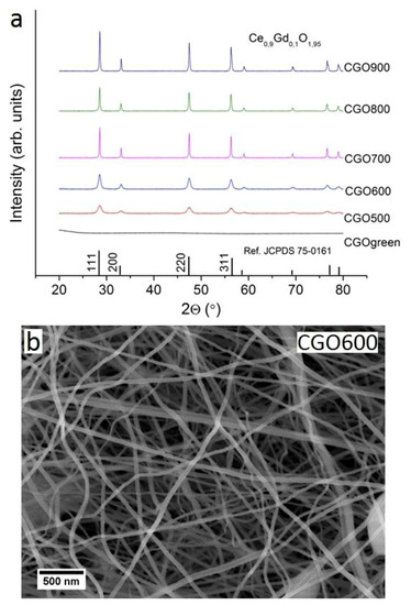 (a) XRD pattern of CGO as electrospun (green) and calcinated at different temperatures; (b) SEM image of nanofibers calcinated at 600 °C.