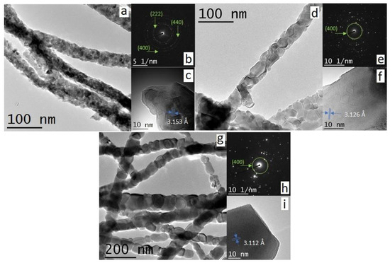 The influence of the calcination temperature on 3D structure of the nanofibrous membranes is crucial both in terms of final grain size at the fibers and for the sintering effect at the intersections between fibers. As the microscopic features of the membranes exhibit similar morphology, for the sake of brevity, only the results of the substrate treated at 600 °C are here in discussed into details. The scanning electron microscopy (hereafter SEM) micrograph at low magnification for the selected membrane (Figure 1b) shows an extended 3D nanofibrous structure composed of nanofibers with high aspect ratios and a narrow and homogeneous distribution of diameters (< 100 nm). The average nanofiber’s diameters are estimated for all the samples and are reported in Table 1. The formation of any dead-end pores (close porosity) is not observed, whilst a wide, open and interconnected porosity is obtained and associated with an exceptionally high porosity. The pore volume is evaluated via the estimation of the mean intercept length in the SEM micrographs [25,56]. The values obtained are in the range of 84–88%, and in agreement with the values obtained in previous research studies in our group [16,25]. Despite the similarity in microscopic morphology, the different calcination temperatures on the single nanofibers (mesoscale and at nanoscale level) lead to significant differences, as also suggested by the analysis of the XRD patterns. In Figure 2a–e, high magnification SEM images for the five samples are shown. For all the CGO membranes, the single nanofibers exhibit a polycrystalline structure that evolves with the temperature from a morphology, with grains increasingly larger and densely packed up to the 1D nanostructures of CGO900, which consist of single grains connected in series like pearls in a necklace. The dimensions of the grains are then estimated from Figure S5 (see Table 1) resulting, within the experimental errors, similar to the crystallite sizes (Figure 2f). For sample CGO500, it is not possible to estimate the grain sizes as they are extremely small. Yet, it is worth mentioning that for CGO900, the dimensions of the grains are comparable with the dimension of the nanofiber’s diameters. Transmission electron microscopy (hereafter TEM) images (Figure 3a,d,g) of three selected samples (CGO600, CGO700, and CGO800) confirm the evolution of the polycrystalline morphology with the grains that gradually grow up to form the pearl collar-like structures (CGO900). The selected-area electron diffraction (SAED) (Figure 3b,e,h) indicates for the three samples a fluorite phase arrangement at the short scale (nanoscale), in agreement with the XRD patterns. The observation is further supported by the high resolution TEM (hereafter HR-TEM) image (Figure 3c,f,i) that shows a well-defined organization of the atoms with a fringe spacing indexed to the (111) plane of the fluorite phase.
