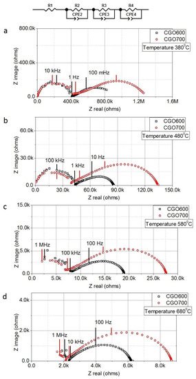 Equivalent circuit and Nyquist plots for CGO600 and CGO700 in the range of temperature investigated increasing respectively from (a–d).