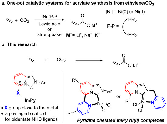 (a) One-pot catalytic systems for acrylate synthesis from ethylene and CO2 [32,33,34]; (b) this research: pyridine chelated ImPy Ni(II) complexes for acrylate synthesis from ethylene and CO2.