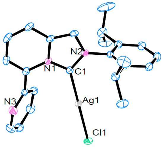 Synthesized ligand precursors were converted to silver (Ag) complexes that could serve useful transmetallating agents for Ni complexes (Scheme 1). Ag(I) complexes (5, 6a–6e, 11) were prepared from the imidazopyridinium salts (3, 4a–4e, 10) by reaction with Ag(I) oxide in good yields (81%–96%) (Scheme 1). After the disappearance of peaks related to the acidic imidazopyridinium proton of 3, 4a–4e, and 10 were confirmed in 1H NMR, Ag complexes were purified by washing with hexane or recrystallization from CH2Cl2 and hexanes. The molecular structure of an Ag complex 5 was characterized by X-ray crystallography (Figure 2). A single crystal for X-ray diffraction was prepared by slow recrystallization from dichloromethane layered with hexane. The crystal structure exhibited a mononuclear Ag(I) complex with a linear geometry, which is attributed to the unique steric effect at C(5) on the ImPy. Similar structural features were observed in other previously reported Ag(I) chloride complexes with ImPy [98].