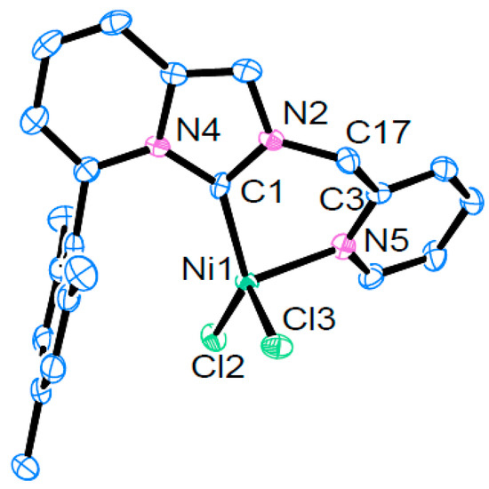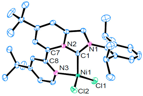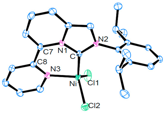 Structural characterization of 7, 8b, and 12 were established by X-ray crystallography. Single crystals of 7, 8b, and 12 suitable for X-ray diffraction analysis were grown through the slow diffusion of n-hexane into a saturated solution of dichloromethane. Three complexes were observed as desired monomeric Ni(II) complexes with four-coordinated species (Figure 3, Figure 4 and Figure 5). The Ni(II) center displays a distorted tetrahedral geometry. The most remarkable structural feature of 7, 8b, and 12 is the coordination of the carbene carbon and pyridine nitrogen (N) to the Ni(II) center, displaying a bidentate C, N chelating mode that yields a six-membered nickelacycle.