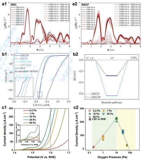 (a) Cationic Fe-doping boosts the in-situ formation of (oxy)hydroxide on the surface of BSCF. Fourier transformed (FT) k3-weighted Co K-edge EXAFS (extended X-ray absorption fine structure) spectra obtained for (a1) BSC and (a2) BSCF during the OER (oxygen evolution reaction); reproduced with permission [] Copyright (2019), American Chemical Society. (b) Anionic F-doping boosts the HER (hydrogen evolution reaction) activity of La0.5Ba0.25Sr0.25CoO3-δ. A comparison of the (b1) HER polarization curve and (b2) HER Gibbs free energy; reproduced with permission [] Copyright (2018), Elsevier. (c) Oxygen partial pressure tunes the oxygen vacancies in NdNiO3 and enhances the OER activity: (c1) OER polarization curve obtained for NdNiO3 at different oxygen pressures and (c2) volcano plot obtained for the OER current density as a function of the oxygen pressure; reproduced with permission [] Copyright (2019), John Wiley and Sons.