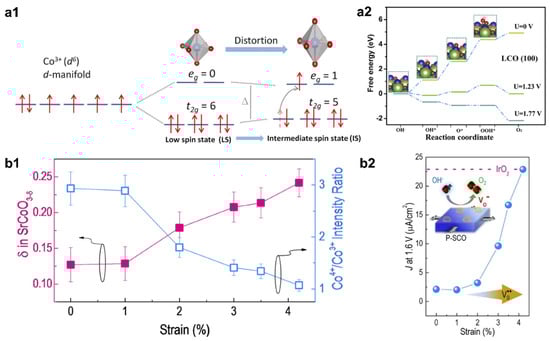 (a) Strain-induced distortion of the CoO6 octahedron in LaCoO3 optimizes the eg orbital filling and OER activity: (a1) A comparison of the spin states and (a2) the OER free-energy diagrams obtained for the LCO (100) film depending on the reaction coordinates; reproduced with permission [] Copyright (2017), Elsevier. (b) Strain-induced tuning of the oxygen vacancies boosts the OER activity: (b1) the dependence of the number of oxygen vacancies (δ) and Co4+/Co3+ ratio in SrCoO3-δ perovskite on the tensile strain, and (b2) the OER current density observed at 1.6 V vs. reversible hydrogen electrode (RHE) as a function of strain; reproduced with permission [] Copyright (2016), American Chemical Society.