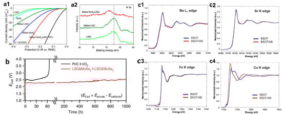 (a) Hybridization of perovskite oxide with MoS2 boosts the HER activity in an alkaline electrolyte: (a1) HER polarization curves obtained in 0.1 M KOH and (a2) the Ni 3p XPS spectra obtained for LNO, milled LNO, and milled MoS2/LNO; reproduced with permission [] Copyright (2018), American Chemical Society. (b) Chronopotentiometric test measured at 100 mA cm−2 for the overall water splitting reaction over 1000 h; reproduced with permission [] Copyright (2019), Springer Nature. (c) Conductive carbon modifies the electronic structure of BSCF. Normalized XANES (X-ray absorption near edge structure) spectra observed at the (c1) Ba L-edge, (c2) Sr K-edge, (c3) Fe K-edge, and (c4) Co K-edge; reproduced with permission [] Copyright (2015), John Wiley and Sons.