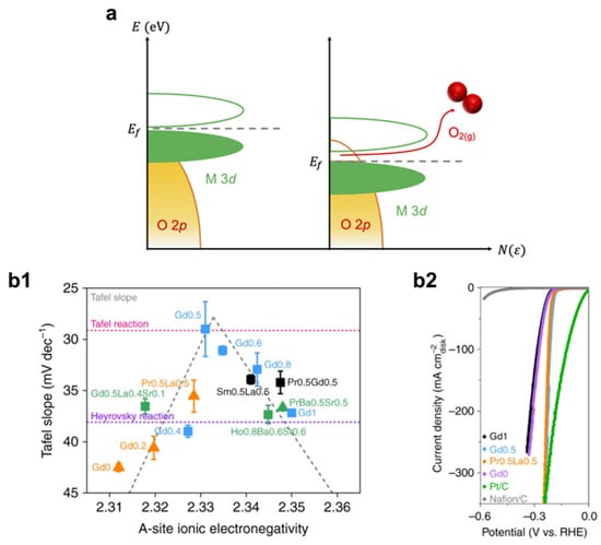 (a) Activating the lattice oxygen redox by improving the metal-oxygen hybridization: (a) A schematic illustration of the band structures observed for LaCoO3 and SrCoO3 during the OER. (b) A-site ionic electronegativity as a descriptor of perovskite oxide HER activity: (b1) The HER Tafel slope as a function of the A-site ionic electronegativity and (b2) polarization curve; reproduced with permission [] Copyright (2019), Springer Nature.