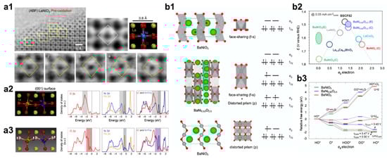 (a) Perturbation of oxygen octahedral in LaNiO3 activates the water oxidation reaction: (a1) STEM image of the distorted oxygen octahedron; and a (density of states) DOS comparison between Fe-doped (001) LaNiO3 (a2) without and (a3) with distorted octahedral oxygen atoms; reproduced with permission [] Copyright (2019), Springer Nature. (b) BaNi0.83O2.5 as a superior OER electrocatalyst: (b1) structures of BaNiO3, BaNi0.83O2.5, and BaNiO2, (b2) OER activity as a function of the eg orbital occupancy, and (b3) DFT-calculated free energy diagrams; reproduced with permission [] Copyright (2016), American Chemical Society.