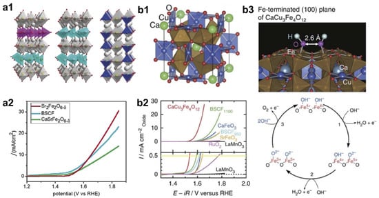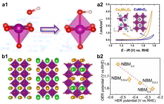 (a) Oxygen-deficient Ca2Mn2O5 perovskite as an OER electrocatalyst: (a1) The plausible effect of the oxygen vacancies in Ca2Mn2O5 on the OER kinetics and (a2) the structure and OER CV; reproduced with permission [] Copyright (2014), American Chemical Society. (b) Orthorhombic NdBaMn2O5.5 as a bifunctional OER and HER catalyst: (b1) The structure (from the left to the right) of Nd0.5Ba0.5MnO3-δ, NdBaMn2O5.5-δ, and NdBaMn2O5.5 and (b2) the OER and HER onset potential obtained at 0.5 mA cm−2); reproduced with permission [] Copyright (2018), American Chemical Society.