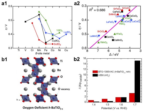 (a) Systematic comparison of various first d-block metal-based perovskite oxides used for the OER: (a1) A comparison of the OER overpotential and (a2) the OER overpotential as a function of the charge transfer energy; reproduced with permission [] Copyright (2014),: American Chemical Society. Oxygen-deficient BaTiO3–δ as a highly-active OER electrocatalyst: (b1) A structural illustration of BaTiO3-δ and (b2) a comparison of the OER mass activity between BaTiO3-δ and Ir550; reproduced with permission [] Copyright (2015), Elsevier.