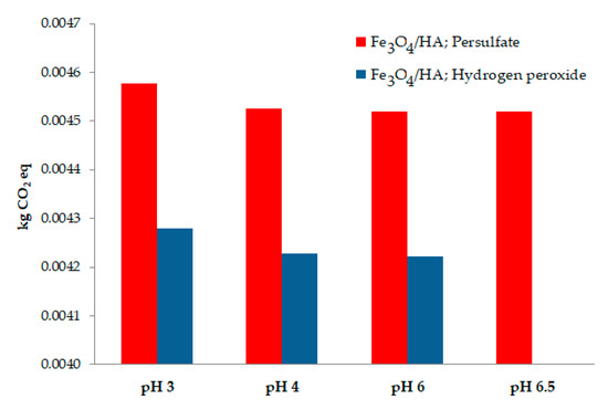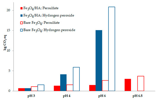 The humic acid coating impact on the CCP was evaluated by comparing the degradation process performed in the presence of coated magnetite with the bare magnetite at different pH conditions, as shown in Figure 1. Moreover, the impact of using persulfate or hydrogen peroxide activation for BPA degradation was also evaluated in the presence of both materials. For all tested pH levels, we observed a higher CCP impact for the bare magnetite compared with the humic acid coated material for both persulfate and hydrogen peroxide at all tested pH conditions. This feature can be justified by the slower degradation that occur in the presence of the bare material. We also observed a CO2 emission increase in raising the pH level, due to a slower degradation rate in these conditions and a longer irradiation time needed (more energy consumed) to achieve the pollutant removal. In fact, when working in the presence of hydrogen peroxide at pH 6, an enormous impact for both materials was observed, while this effect was significantly lower in the presence of persulfate, even at pH 6.5.