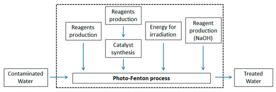 The industrial application of photo-Fenton processes brings out the need for a comprehensive evaluation of several aspects. This assessment should take into account not only the mere mechanistic aspects that lead to a greater effectiveness in degrading pollutants but also the environmental impacts generated by these processes. As far as we know, a limited number of studies have addressed an environmental assessment of the photo-Fenton processes. Some of these, set on a laboratory scale, have pointed out that the greatest impacts are related to energy consumption, namely the energy used for irradiating the system, pumping, stirring, etc. [13,14]. On the contrary, on a larger scale (pilot plant), Gallego-Schimd et al. [15] highlighted how chemicals and specifically EDDS, which is used as a complexing agent in neutral photo-Fenton, contribute to around 70% of the overall impacts associated to the life cycle of a pilot plant. A recent study of Feijoo et al. [10] assessed the environmental performance of the synthetic route for preparing different magnetite particles, which represent a promising option as a heterogeneous catalyst for Fenton and photo-Fenton processes.