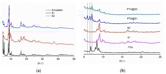 The PXRD patterns of all samples, including pure PTA, were shown in Figure 1. Both synthesized MIL-101 samples S1 and S2 were well matched for the simulated pattern, which confirmed the structure of MIL-101 (Figure 1a). For PTA@S1 and PTA@S2, the main peaks of MIL-101 still can be found in the PXRD patterns, which proved that the immersion process did not affect the framework of MIL-101s (Figure 1b). However, three new strong peaks came out in the region of 6~8° 2 θ compared with MIL-101, and they did not match the pattern of PTA (Figure 1b). In fact, those new peaks had arisen from the highly loaded PTA molecules in the pores of MIL-101s, and this result was in line with the literature reported []. The stronger reflection peaks in PTA@S1 may suggest a higher loading of PTA component than that of PTA@S2.