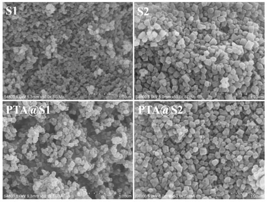 SEM images of MIL-101s and composites were presented in Figure 2; the morphology of S1 and S2 had significant differences. S1 showed obviously smaller particle sizes than that of S2, and most particles of S1 were irregular, while the particles of S2 displayed regular octahedral morphology that was consistent with other reports [,]. After immersion, PTA@S1 and PTA@S2 possessed the same appearance with their corresponding MIL-101, and no PTA crystals were found, which suggested that the PTA residuals outside the pores of MIL-101s were removed during the washing procedure.
