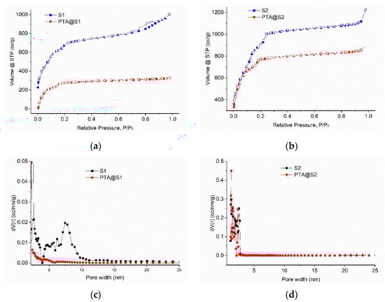 N2 adsorption-desorption isotherms of (a) S1, PTA@S1, (b) S2 and PTA@S2. Pore size distributions of (c) S1, PTA@S1, (d) S2 and PTA@S2.
