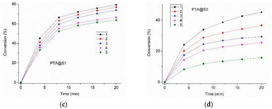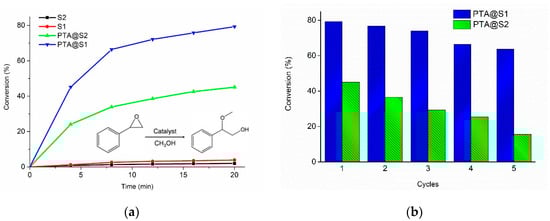 In order to compare the catalytic capability of the PTA@S composites, the catalytic methanolysis of styrene oxide was tested, and the intermediate was monitored periodically by gas chromatography (GC) analysis (Figure 4, Table 2). The product was identified by comparing it the stand pure 2-methoxy-2-phenylethanol methanol solution. No other products were found. So as to keep each catalytic test with the same amount of PTA in catalysts, 10 mg of PTA@S1 and 40 mg of PTA@S2 were used in the experiments (based on ICP-OES results). PTA was the efficient catalyst in this reaction, and the pure MOF samples S1 and S2 had no activity (Figure 4a). PTA@S1 produced much higher catalytic activity than PTA@S2, even when they contained same amount of PTA (Figure 4a). For instance, in the 1st run after 20 min, the conversion of styrene oxide with PTA@S1 sample was 79.3%, while the conversion with the PTA@S2 sample was only 45.1% (Table 2). The turnover number (TON) value of PTA@S1 was 177.32, which was near a pure PTA system with TON of 194.81. While for PTA@S2, the TON value was only 100.22, which was much lower than the case of PTA@S1. The turnover frequency (TOF) values of PTA@S1 (3.07 mmol·g−1·min−1) were 1.77 times greater than that of the PTA@S2 sample (1.74 mmol·g−1·min−1). Moreover, PTA@S1 exhibited superior catalytic performance to PTA@S2 and was recyclable without large activity drop, indicating excellent stability (Figure 4b). After five cycles, the conversion of styrene oxide with the PTA@S1 was still 63.7% (Figure 4c), while for PTA@S2 sample the conversion dropped to 15.7% (Figure 4d). Hence, in the 5th run, PTA@S1 still possessed over 80% of catalytic activity of 1st run, while for PTA@S2 the catalytic activity was less than 35% of 1st run (Table 2). It is worthy to notice that, for the homogenous PTA catalysis, the TOF value was 3.38 mmol·g−1·min−1, which was only 10% higher than that of PTA@S1. In order to figure out the reason for catalyst deactivation, the content of element W in filtrate of catalyst after each run was also tested (Table 3). The results revealed that, after every reaction, the PTA leaching in both cases were quite limited, and over 90% of PTA component remained in the composite. Thus, one possible explanation of such catalyst deactivation was the blocking of active sites by reaction product. PTA@S1 had hierarchical larger mesopores, which allowed for faster mass transport than that of PTA@S2, and exhibited better reusability. Thus, in addition to an advantage in terms of their encapsulation of large active components, the hierarchical pores facilitated the transport of large substrates/products, revealing the advantage of hierarchical MOF.