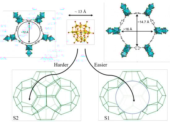 The schematic drawing of natural aperture windows of MIL-101 and phosphotungstic acid (PTA) molecules, and the comparison of difficulty when PTA molecules diffused into the structure of S1 and S2.