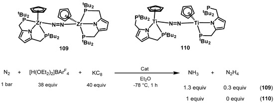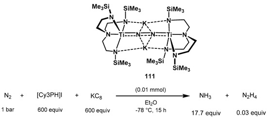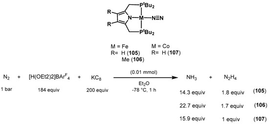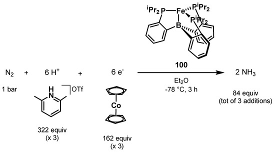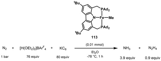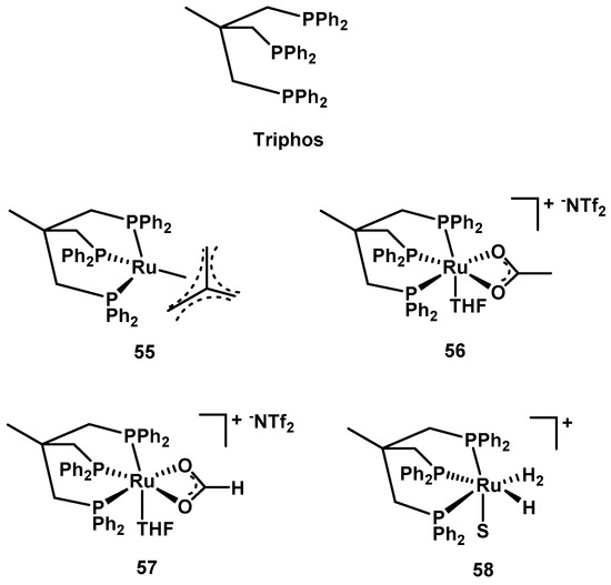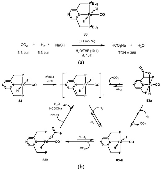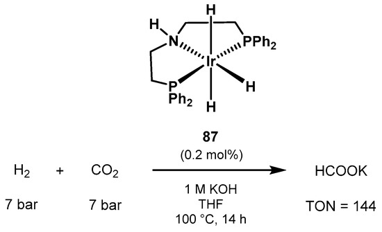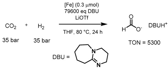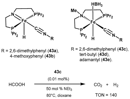 In 2011, following previously reported works on iron-catalyzed formic acid dehydrogenation [382,383]. Beller reported the remarkable activity of an iron complex bearing the tetradentate tripodal ligand tris[(2-diphenylphosphino)ethyl]phosphine [P(CH2CH2PPh2)3 (PP3) [384]. The authors tested both the in situ formation of the active species, as well as various synthesized iron hydride complexes bearing the same PP3 ligand. The activity of the synthetized catalysts was found to be comparable with that of the in situ formed systems in the presence of 2 equivalents of PP3 ligand. After optimization, simply applying 5 mmol of Fe(BF4)2·6H2O and 2 equivalents of PP3 to a solution of formic acid in propylene carbonate, afforded a TOF of 9425 h−1 and a surprising TON of 92,000 at 80 °C.