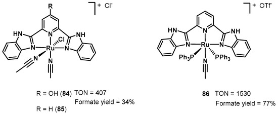 The reforming of methanol to produce hydrogen is currently carried out at elevated temperatures (>200 °C) and pressures (>25 bar) by means of heterogeneous catalysts such as Pt/ Al2O3, as well as the less expensive Cu/ZnO/Al2O3 [323,324,325,326,327,328]. As discussed below, pincer complexes allow the direct release of hydrogen gas from aqueous methanol at temperatures below 100 °C, with low catalyst loadings as well as promising stability properties.
