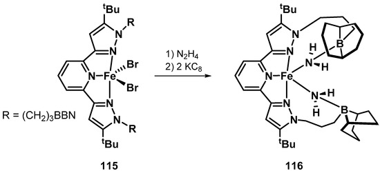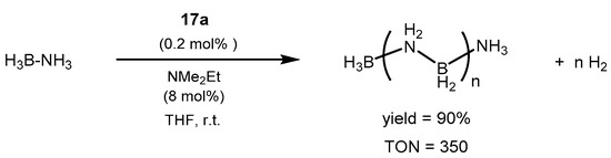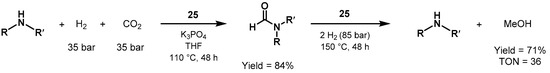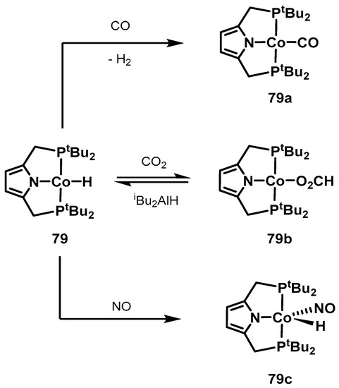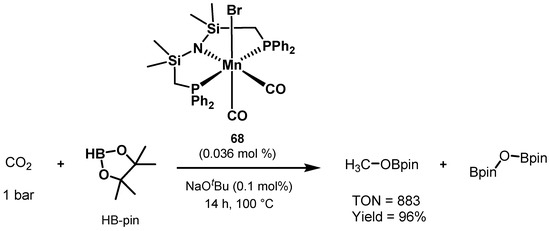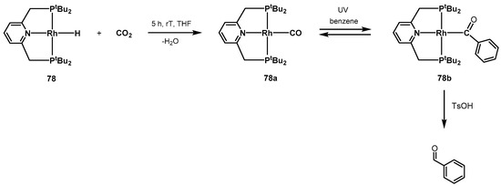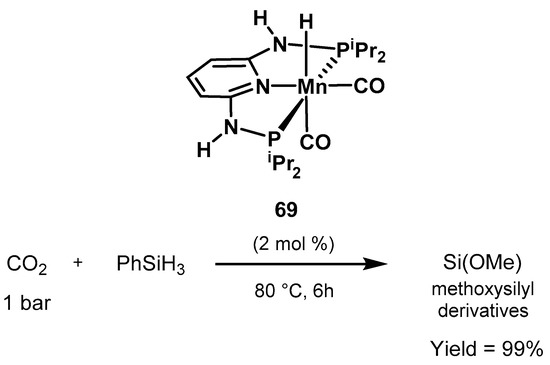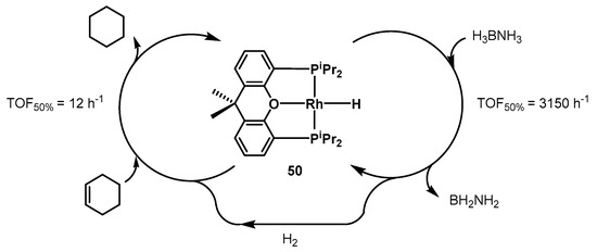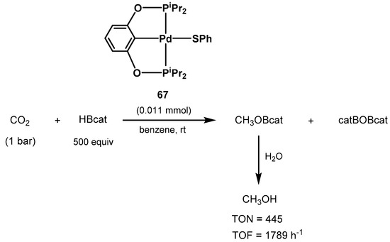 Furthermore, several groups have been exploring the use of pincer complexes for a wide series chemical transformations, further expanding the applicability of this family of catalysts. Representative examples include olefination [130,131,132], hydroamination [133,134,135], hydrocarboxylation [136], hydrovinylation [137], aminomethylation [138], dehydrogenation of alkanes [139,140,141,142,143,144], alkane metathetis [145], N-formylation of amines [146,147], C-alkylation of secondary alcohols [148,149], α-alkylation of ketones [150,151], and alkylation of amines [152,153,154,155,156] and anilines [157].