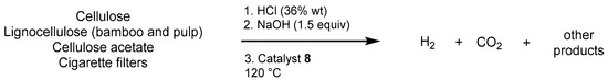 Polyols such as glycerol or carbohydrates might be considered as direct biomass-to-hydrogen suppliers, but their more complicated dehydrogenation pathways as well as lower hydrogen content currently render them unfavorable as hydrogen sources. In this light, Beller screened in 2015 a series of PNHP-Ru and -Ir complexes (Ru-MACHO, Ru-MACHO-BH, 5, 8, 10) for hydrogen production from several bio-substrates obtained from biomass [182]. Hydrogen evolution was observed from cellulose, fructose, glucose, lignocellulose, as well as from (used) cigarette filters (cellulose acetate). After optimization, it was possible to release hydrogen at temperatures at 120 °C using ppm amounts of catalyst 8 and stoichiometric amounts of NaOH in a one-pot protocol (Scheme 5). A remarkable TON of about 6000 after 3 h was obtained using 20 ppm of complex 8 in the conversion of cellulose resulting in a 1.00:1.09 mixture of H2/CO2.