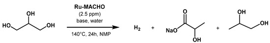 The same group also proposed a Ru-catalyzed hydrogen production from glycerol accompanied by the selective synthesis of sodium lactate, the monomer for the synthesis of polylactic acid (Scheme 6) [315]. The screening involved the same family of catalysts used in the above-mentioned work. Using only 2.5 ppm of Ru-MACHO and 1.08 eq. of KOH (7.3 M), it was possible to obtain full conversion and 67% yield of sodium lactate.