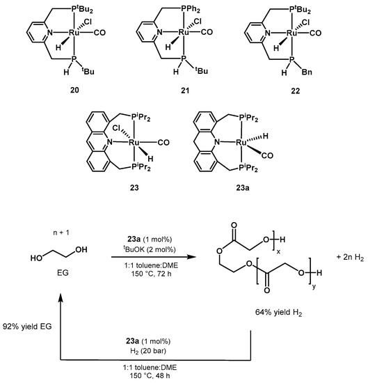 Recently, Milstein proposed a reversible and efficient liquid-organic hydrogen carrier using ethylene glycol (EG) [319]. The authors screened various Ru-PNP catalysts bearing different substituents in the N and P arms (Scheme 8). After optimization, catalyst 23a reached 97% conversion and 64% yield of H2. In addition, it was possible to hydrogenate the reaction mixture using the same catalyst and same reaction conditions, resulting in full conversion to ethylene glycol.