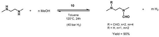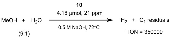 In 2014, Beller showed that it is feasible to generate hydrogen from ethanol/water mixtures as well as from industrial bio-ethanol obtained from fermentation processes, without prior removal of the water content (5%) [181]. Catalyst 10 was active using various water contents (EtOH/H2O [v/v] 9:1, 7.5:2.5, 5:5), producing only trace amounts of CO2 and CO (<10 ppm), of key importance for the direct use of hydrogen in fuel cells. Under optimized conditions, using 25 ppm of catalyst 10 (Scheme 3) and 8 M NaOH, the reaction resulted in TOF of 1707 h−1 and 1613 h−1 after 1 and 3 h, respectively. A long-term experiment was also carried out, affording 70% yield after 98 h at 88 °C, resulting in a TON as high as 80,000 and 7.8 L of hydrogen gas produced. Remarkably, the system showed comparable activity to the aqueous ethanol solution also when applying real fermented bio-ethanol (TOF = 1770 h−1 and 1686 h−1 after 1 and 3 h, respectively).