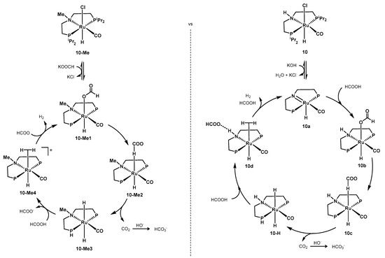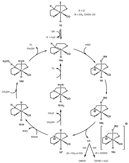 In 2016, Beller investigated the mechanism of aqueous methanol dehydrogenation using the state-of-the-art catalyst under highly alkaline conditions, complex 10, and compared with its N-Me congener 10-Me. The proposed catalytic cycle depicted in Scheme 15 was obtained combining experiments, isolation of key intermediates, NMR characterization, single crystal X-ray crystallography, and DFT calculations [337]. Contrarily to the previously invoked outer sphere mechanisms, the authors proposed an inner sphere pathway for the C-H cleavage step, promoted by base. The required amount of base is essential to increase the reaction rate; the authors noted an increase in the ratio of 10″/10′, indicating the “inner-sphere” C–H cleavage, via C–H coordination of the methoxide to the ruthenium center. The lower, but comparable, catalytic activity of 10-Me with its PNHP counterpart provides further experimental evidence to the role of the N-H moiety in PNP-catalyzed dehydrogenation reactions [193,338,339,340].