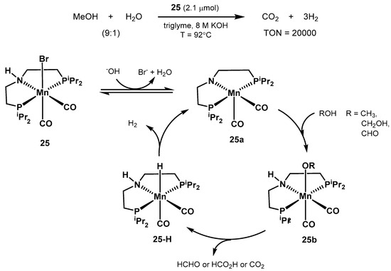 In 2017, Beller proposed the structurally defined manganese complex 25 as an active catalyst for aqueous methanol dehydrogenation (Scheme 16) [346]. The optimized conditions resulted in 20,000 turnovers after 900 h at 92 °C, starting from a 9:1 CH3OH/H2O mixture in triglyme, with 8M KOH, and in the presence of 10 equivalents of the PNP ligand to the catalyst (2.1 μmol). Moreover, other organic carriers such as ethanol, paraformaldehyde, and formic acid were successfully dehydrogenated as well. Unlike the previous work by Bernskoetter, Hazari, and Holthausen [336], the presence of Lewis acid additives resulted in no observable improved catalytic activity.