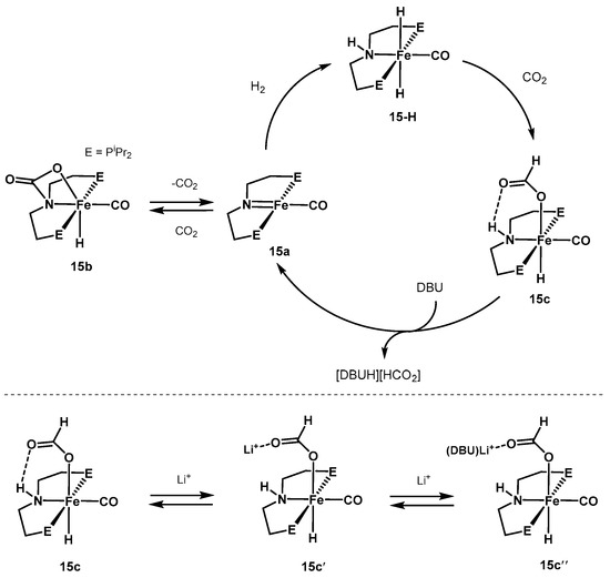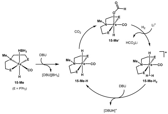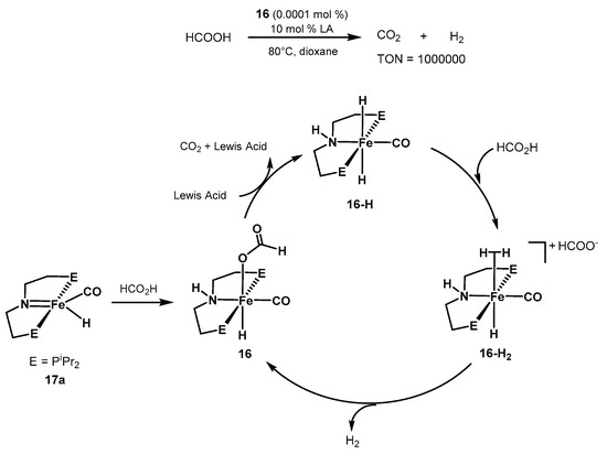 Schneider and Hazari’s Lewis acid assisted formic acid dehydrogenation with the Fe-PNP catalyst 16 [389].