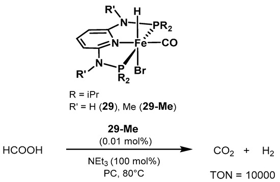 Continuing the exploration of iron pincer complexes, Gonsalvi and Kirchner proposed in 2016 a series of Fe-PNP complexes bearing the 2,6-diaminopyridine scaffold (Scheme 20) [391]. Using propylene carbonate (PC) as solvent and 100 mol% of NEt3 as base additive, led to full conversion of formic acid into H2 and CO2 at 80 °C. A TOF = 2635 h−1 after one hour and a turnover number of 10,000 after six hours were achieved using 0.01 mol% of catalyst 29-Me. Curiously, the authors explored the effect of Lewis acid additives as well. Contrarily to the results reported by Schneider and Hazari using Fe-PNP catalysts [389], this work showed that replacing the base with 10 mol% of LiBF4 resulted in no conversion of formic acid.