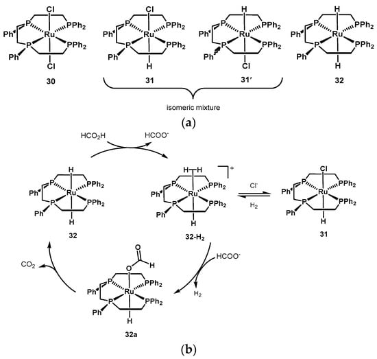 In 2014, Beller proposed a base-free, bi-catalytic system formed by Ru-MACHO-BH and Ru(H2)(dppe)2 (dppe = 1,2-bis(diphenylphosphino)ethane) as shown in Scheme 13a [334]. The former catalyst is similar to Ru-MACHO but, importantly, can be activated by heat instead of by base within the reaction temperature window employed here. The authors screened several co-catalysts in order to improve the step of formic acid dehydrogenation. After optimization, Ru(H2)(dppe)2 was found to be the optimal option. The authors proposed a synergetic interaction between the two catalysts; indeed, the volume of gas produced by the bi-catalytic system was much bigger than the gas evolution observed with the single catalysts separately, which showed very little gas evolution. The optimized system gave a turnover number >4200 with very low catalyst loading (5 μmol of each catalyst) and only traces of CO impurity (<8 ppm), yielding 26% of hydrogen (based on water).