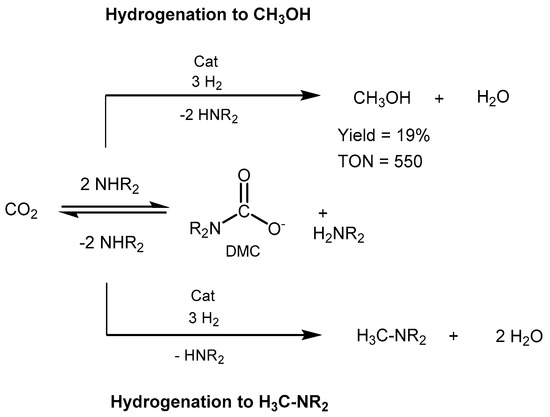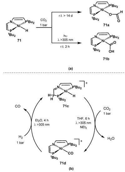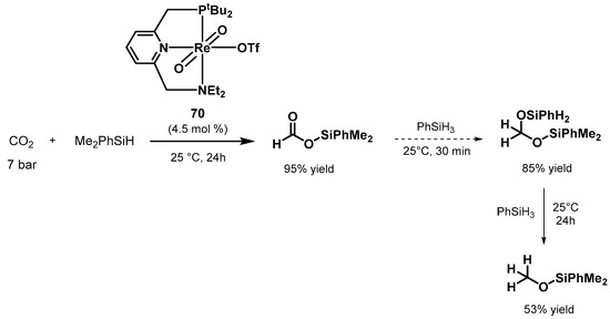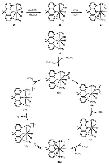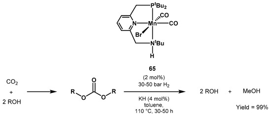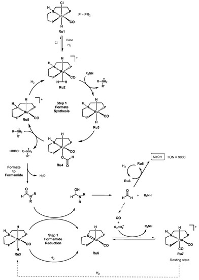 The same group carried out mechanistic studies on aqueous methanol dehydrogenation using well-defined manganese and rhenium catalysts, under both base-free as well as strongly basic conditions [341]. Fu used DFT calculations to propose a self-catalytic role of methanol in ruthenium PNP-catalyzed dehydrogenation [342]. Several authors have studied the process in depth, using inter alia, DFT calculations, NMR spectroscopy, or Raman-GC techniques [343,344,345].