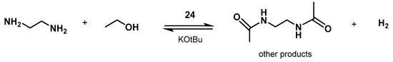 Since their seminal work, the Milstein group has continued exploring novel pincer complexes leading to a series of novel synthetic applications using the AAD methodology [205]. As previously mentioned, the sustainability effect of carrying out dehydrogenation reactions by AAD relies not only on the concomitant production of H2, but also on the absence of waste, and hence an excellent atom efficiency. The field is extensively growing, and pincer complexes are contributing to the main advances. Several groups have explored new routes for the syntheses of numerous new product types by means of AAD reactions. For example, starting from alcohols and amines, it is now possible to selectively obtain amides [221,222,223,224,225], imines [226,227,228], imides [229], polyamides [230], pyrroles [231,232,233,234,235], pyridines [236], pyrazines [237,238,239], pyrimidines [240], hydrazones [241], quinolines [242], or aldimines [243,244]. AAD of alcohols also provide access to clean, efficient routes to carboxylic acids [245,246,247,248], ketones or aldehydes [249,250,251], esters [252,253,254,255,256], acetals [257], alkenes [258], as well as lactones [259,260,261].