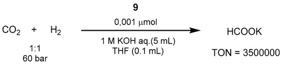 - Sanz, S.; Benítez, M.; Peris, E. A New Approach to the Reduction of Carbon Dioxide: CO2 Reduction to Formate by Transfer Hydrogenation in i PrOH. Organometallics 2010, 29, 275–277. [Google Scholar] [CrossRef]