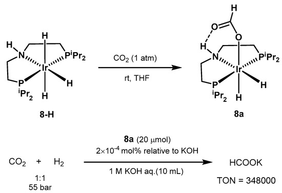 The same group showed that, similar to the PNP complexes of ruthenium, iron, and manganese, also the iridium-PNP catalyst 8 is able to promote methanol dehydrogenation under mild conditions albeit with lower catalytic activity [347]. Complex 8 afforded a TON of 1900 after 60 h at 92 °C, showing promising stability over time. In this case too, highly basic conditions were required (8M KOH) for consistent catalytic activity starting from a 9:1 mixture of CH3OH/H2O.