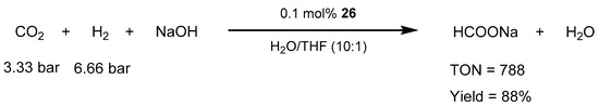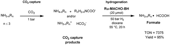 In 2015, Prakash and Olah proposed a remarkable example of CO2-free energy storage and release based on the formate/bicarbonate couple, which act as both hydrogen carrier and CO2 storage system [390]. The authors showed a continuous cyclic system of either CO2 or bicarbonate hydrogenation to formate and subsequent hydrogen release from formate (Scheme 19). The catalyst screening involved the well-known and robust Ru-MACHO, Ru-MACHO-BH, and the N-methylated MePNP congener of Ru-MACHO. The system is amine-additive free and requires neither pH control nor change of solvent between the cycles; the same catalyst performs in both the hydrogenation and dehydrogenation steps. In a combined experiment, and by simply changing the reaction pressure, it was possible to obtain 90% conversion in both directions with a combined turnover number of 11,500 obtained after six full cycles of hydrogenation/dehydrogenation with Ru-MACHO-BH. The possibility of performing both transformation by only changing one parameter, such as pressure, is highly favorable for hydrogen-storage batteries. Importantly, the two N-H and N-Me PNP catalysts showed similar catalytic activities under the same reaction conditions and for both directions, with the N-Me PNP complex being the most active in the dehydrogenation of sodium formate, resulting in a TON of 1000 (TOF = 430 h−1 after 2 h) with 0.1 mol% catalyst loading in a 2:1 mixture H2O:1,4-dioxane as solvent. A TON of 5000 was achieved lowering the catalyst loading down to 0.01 mol%, albeit with only 50% yield in H2.