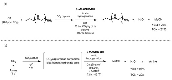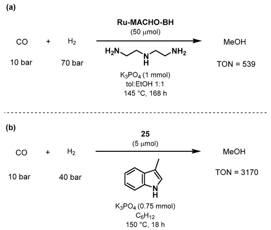 Beller’s bi-catalytic systems for methanol dehydrogenation catalyzed by Ru-PNP complexes [334,335]. (a) Ru-MACHO-BH + Ru(H2)(dppe)2 (2014) and (b) 10 + 10-Me (2019).