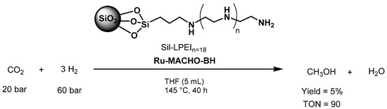 The same year, Haumann explored the immobilization of the known ruthenium iPrPNP catalyst 10 for the continuous gas-phase steam reforming of methanol [349]. Using the supported liquid phase (SLP) technology, the authors investigated the activities of the prepared catalysts using an array of support materials. The best result in terms of activity and stability was achieved using pure KOH deposited onto alumina support. The system was stable for 70 h on stream and only trace amounts of CO were observed.