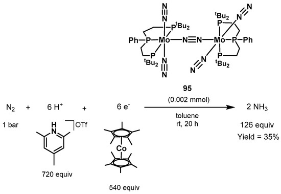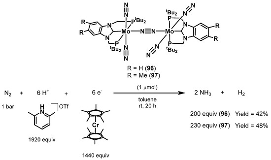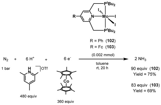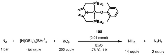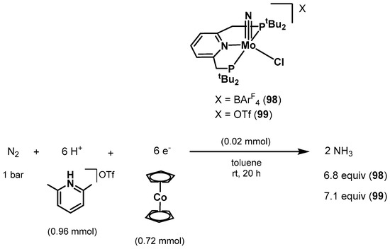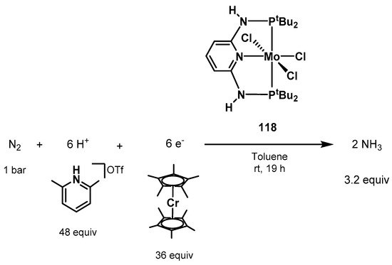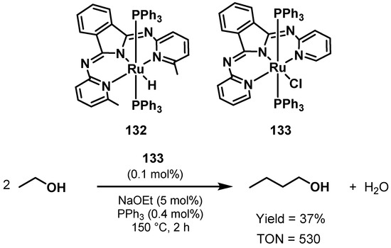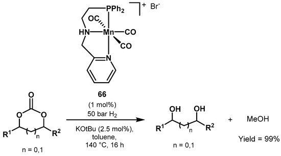 The deoxydehydration (DODH) of biomass-derived vicinal diols and polyols has also been explored by employing metal pincer complexes. The reaction proceeds in the presence of a sacrificial reducing agent and results in the formation of alkenes, relevant building blocks for the polymer industry. Some examples using pincer ligation are reported with vanadium [106,107], rhenium [158], as well as molybdenum pincer catalysts [159]. The field is relatively immature and further optimization is necessary. A comprehensive overview of the best catalytic systems for DODH reactions, including the aforementioned pincer complexes, is provided in the detailed reviews of Fristrup [160] and Monbaliu [161].