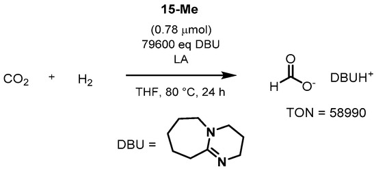 Inspired by the afore-mentioned works carried out by Beller and Milstein using first row transition metals, Schneider and Hazari showed in 2014 that the formate iron-PNP complex 16, combined with a suitable Lewis acid co-catalyst, is particularly active for formic acid dehydrogenation [389]. As such, employing 0.0001 mol%, or merely 1 ppm, of 16 in the presence of 10 mol% of LiBF4, a TOF of 196,728 h−1 was obtained after one hour and a remarkable TON of 983,642 after 9.5 h. As mentioned earlier, the role of the LA is supposed to facilitate the release of formate from the iron formate intermediate, a task usually carried out by basic additives. The reactions were performed at 80 °C in dioxane (Scheme 18). The gaseous products consisted in a 1:1 mixture of H2 and CO2 with CO concentration less than 0.5%. The activity of the system showed in this work (TON = 1,000,000) is the highest reported for non-precious transition metals.