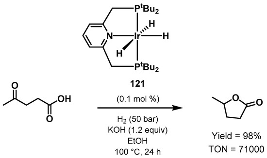 - Li, W.; Xie, J.-H.; Lin, H.; Zhou, Q.-L. Highly efficient hydrogenation of biomass-derived levulinic acid to γ-valerolactone catalyzed by iridium pincer complexes. Green Chem. 2012, 14, 2388. [Google Scholar] [CrossRef]