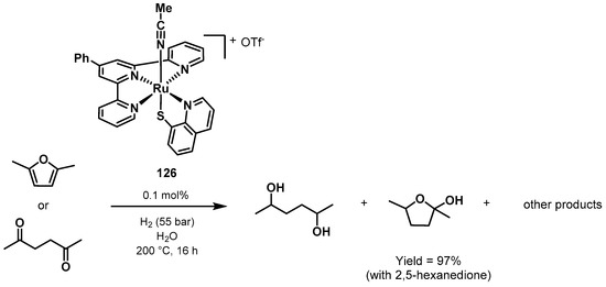 - Sullivan, R.J.; Kim, J.; Hoyt, C.; Silks, L.A.; Schlaf, M. Ruthenium-8-quinolinethiolate-phenylterpyridine versus ruthenium-bipyridine-phenyl-terpyridine complexes as homogeneous water and high temperature stable hydrogenation catalysts for biomass-derived substrates. Polyhedron 2016, 108, 104–114. [Google Scholar] [CrossRef]