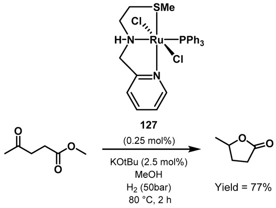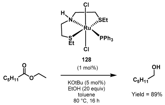 - Stadler, B.M.; Puylaert, P.; Diekamp, J.; van Heck, R.; Fan, Y.; Spannenberg, A.; Hinze, S.; de Vries, J.G. Inexpensive Ruthenium NNS-Complexes as Efficient Ester Hydrogenation Catalysts with High C=O vs. C=C Selectivities. Adv. Synth. Catal. 2018, 360, 1151–1158. [Google Scholar] [CrossRef]