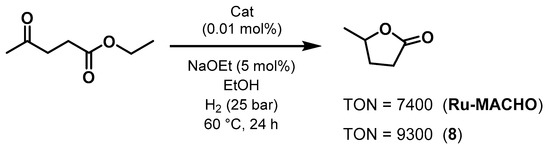 - Fábos, V.; Mika, L.T.; Horváth, I.T. Selective Conversion of Levulinic and Formic Acids to γ-Valerolactone with the Shvo Catalyst. Organometallics 2014, 33, 181–187. [Google Scholar] [CrossRef]