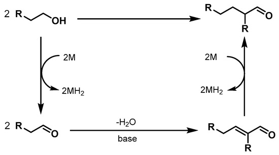 - Chakraborty, S.; Piszel, P.E.; Hayes, C.E.; Baker, R.T.; Jones, W.D. Highly Selective Formation of n-Butanol from Ethanol through the Guerbet Process: A Tandem Catalytic Approach. J. Am. Chem. Soc. 2015, 137, 14264–14267. [Google Scholar] [CrossRef]