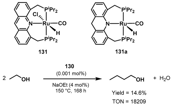 In 2013, Beller showed the efficient conversion of ethanol into ethyl acetate using Ru-MACHO, reported in 2012 to efficiently catalyze ester hydrogenation [220]. The reactions were performed at refluxing conditions and in the presence of NaOEt, necessary for the catalyst activation through Cl− elimination (Scheme 4) [180]. Furthermore, it was speculated whether the ethoxide plays an active role in driving the reaction further from the acetaldehyde intermediate to the ethyl acetate product. Under optimized conditions, the reaction afforded 77% yield in ethyl acetate (TON = 15,400) using 50 ppm of Ru-MACHO, 0.6% mol of NaOEt, at 90 °C, after 46 h. Curiously, in the screening of catalysts, the Ir-PNP catalyst (8 in Scheme 2) synthetized by Abdur-Rashid [79], as well as the Milstein PNP catalyst 4 [204], were found to be practically inactive for this transformation under the given reaction conditions.